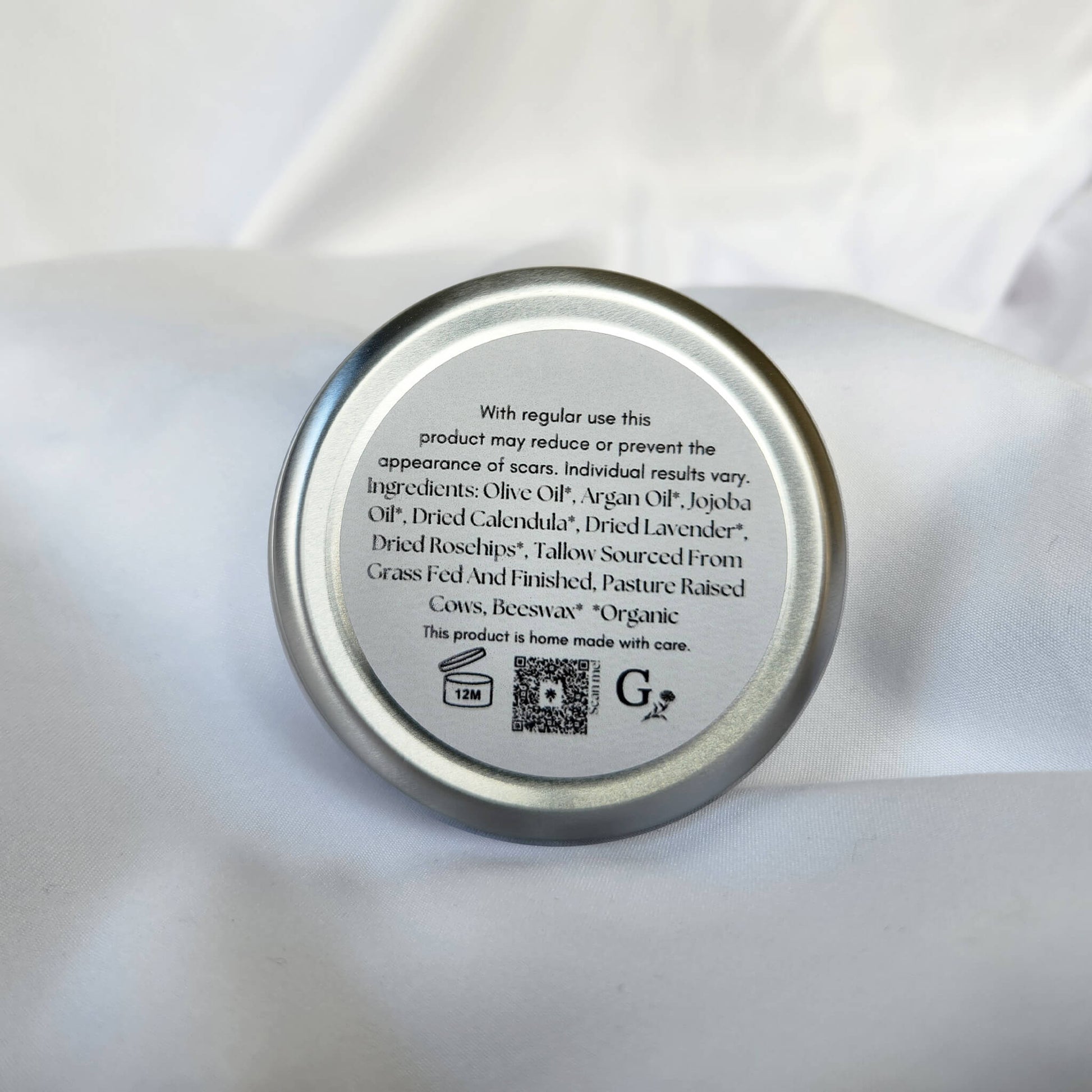 This nourishing balm is carefully crafted to support your skin's natural healing process. Made with a blend of soothing botanicals, skin-rejuvenating oils, grass-fed beef tallow, and organic beeswax, it helps to improve elasticity, calm inflammation, and lock in moisture. The rich combination leaves your skin feeling soft, smooth, and renewed. Ideal for scars, stretch marks, and troubled skin, this balm deeply hydrates and nourishes where you need it most, providing a protective barrier for long-lasting healing and restoration.